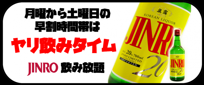 14時のオープンから18時までバーエリアでJINROが飲み放題。お茶系やジュース等の割物もご用意しておりますのでお酒が苦手な人も飲み物あります。