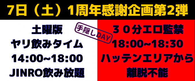 いつもは16時から18時までやっている飲み放題【ヤリ飲みタイム】月曜は19時までヤリ飲みタイム延長決定