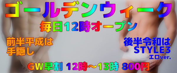 STYLE-3(手隠し・ミニタオル・アンダーウェア)にプラスワン!上半身のみ着衣でも店内滞在OKです 好きなスタイルを選んで遊ぼう Yシャツのリーマンやタンクトップのみのエロ男子は見てるだけでムクムクするっ!? ラッシュガードや意外と前全開パーカーやジャージがエロ度高い! アンダーウェアはレンタル無料*1時間以上ご滞在の場合のみ *レンタルアンダーウェアは必ず受付へ返却願います。返却ができない場合はお買取金額と諸費用を申し受けます。 *全裸・局部を露出しての徘徊はご遠慮願います。