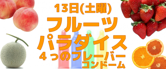 13日(土曜)フルーツパラダイス 2019-07-08 / admin ?オレンジ ?イチゴ ?ピーチ ?メロン 4種類の香りつきフレーバーコンドームからお好きなものを1つプレゼント 土曜はナニ味ち◯ぽにする? ※プレゼントは強制ではございません。ご事情で受け取れない、持ち帰れないお客様はその旨お伝えください。 ※景品は多数ご用意しておりますが数に限りがございます。無くなり次第終了となります。 event, news Previous post 遅割2030 Next post 12日(金曜)褌FUNDOSHIイベント