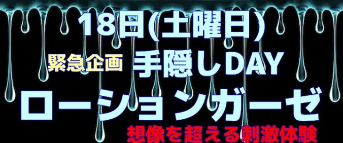 18日(土曜)ローションガーゼ手隠しDAY 2020-01-15 / admin 今度の土曜は 「ローションガーゼ」 店内スタイルを手隠しに変更! 亀頭責め好き集合 店内にローションガーゼのコーナー設置 ローションとガーゼで何するの?って君はGoogleで検索して予習しよう ローションガーゼをGoogle検索 ローションガーゼの超絶刺激を体験! この刺激の虜になる人続出中 翌朝7時まで営業 20:30から翌朝7:00までは入店料金1,000円 0時以降はブランケット無料貸出 event, news Previous post 15日(水曜)大乱闘ゴーグルブラザーズ SPECIAL Next post 17日(金曜)アンダーウェアーDAY