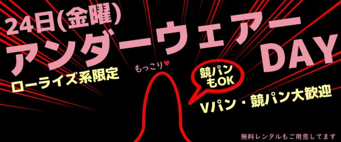24日(金曜)アンダーウェアーDAY 2021-12-22 / admin 全員ローライズアンダーウェアーでハッテン! モッコリが強調されるローライズ系のアンダーウェアーの着用をお願いします 「エロいパンツ買ったけど自撮りしかしてないっす」だったら今日は見せつけるチャンス!! 「そんなの持ってないよ」って君は無料レンタルをご利用ください ✌️競パン大歓迎✌️ *トランクスやのびのびボクサー等イベントコンセプトにマッチしないアンダーウェアー着用のお客様にはお声掛けさせていただきます event, news Previous post 25日(土曜)ネイキッドサタデー裸ネクタイ Next post 26日(日曜)ハレンチ!痴漢列車発射